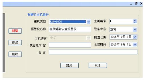 A、新增:如上圖所示:單擊“新增”按鈕,此時“新增”按鈕的顏色為紅色。在報警儀主機維護框中,選擇相應的主機類型、主機編號、報警儀名稱等參數,按“提交”后將新增加一條輻射報警儀主機記錄